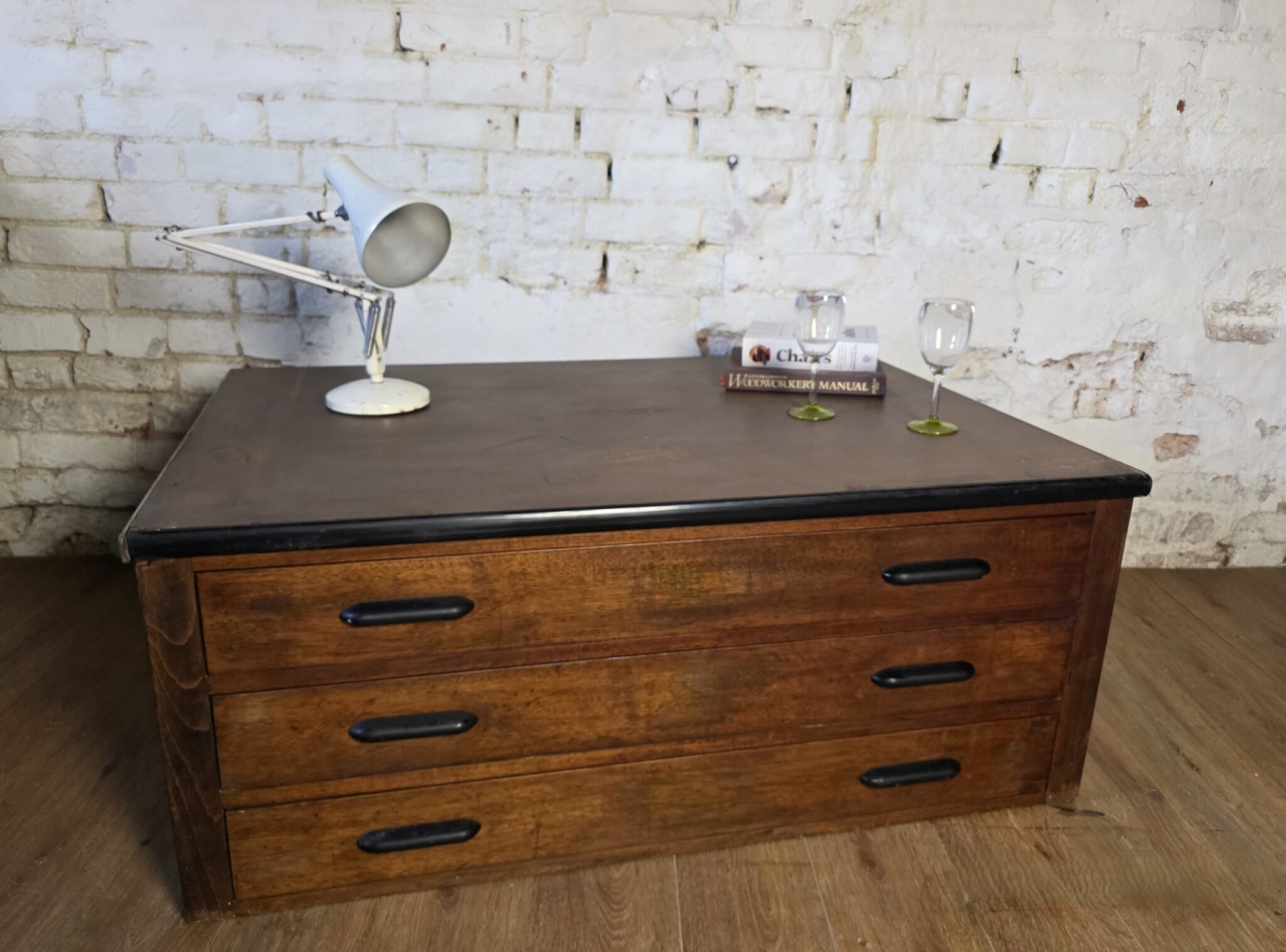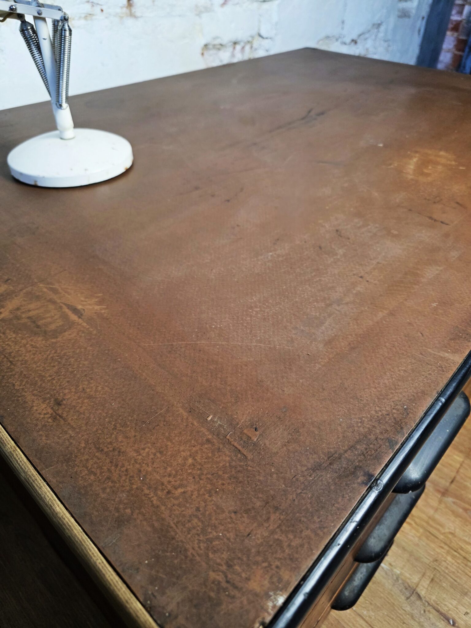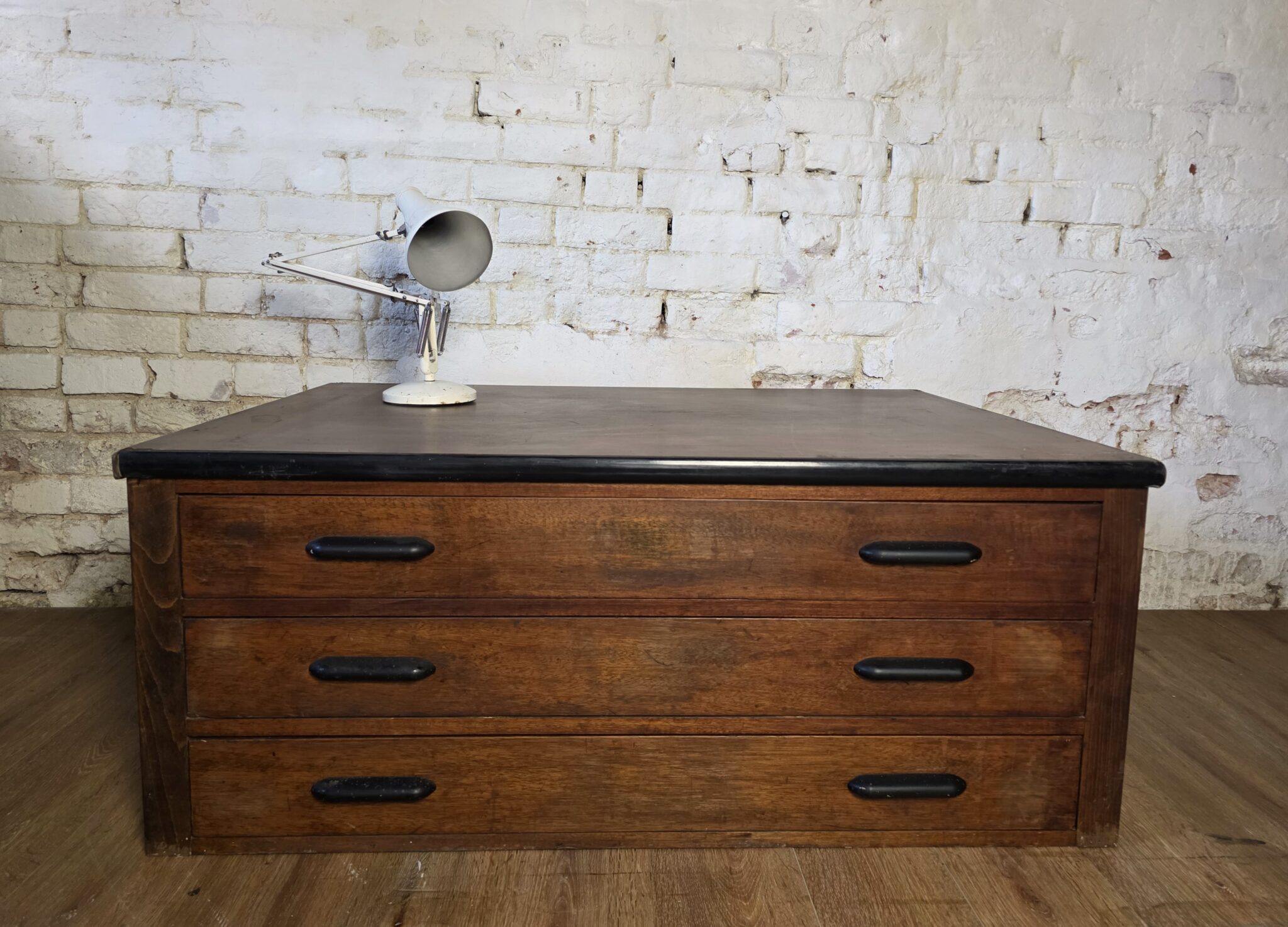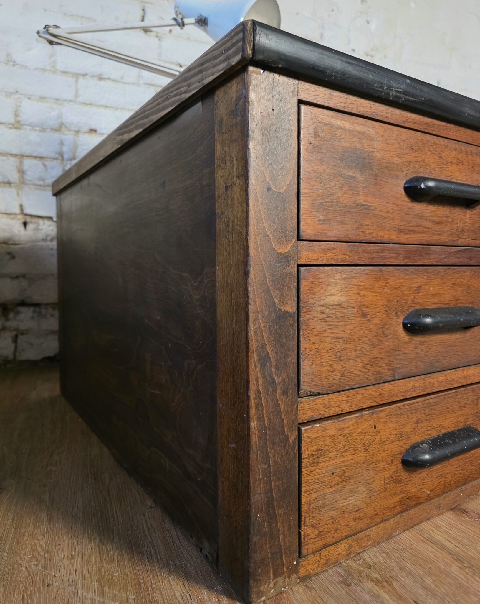 The leather top has naturally aged over many years of use and with no rips or tears which goes beautifully with the rest of the plan chest.