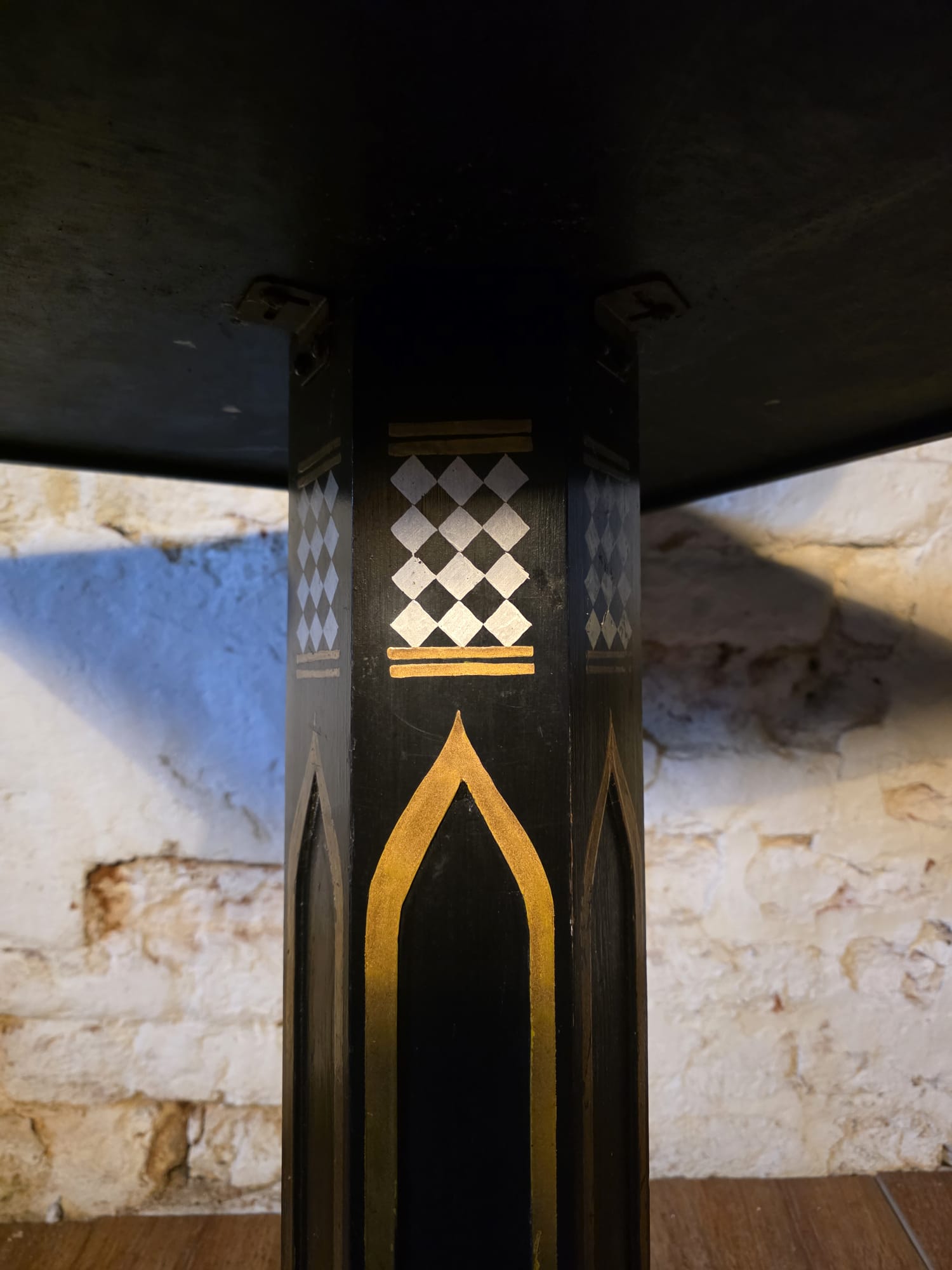 Made specially for Waffles, these one off Ebonised wooden tables were handpainted in a Morrocon style for the upstairs resturant part of the bar. Original condition, used with a few signs of wear but sturdy tables in good used condition.